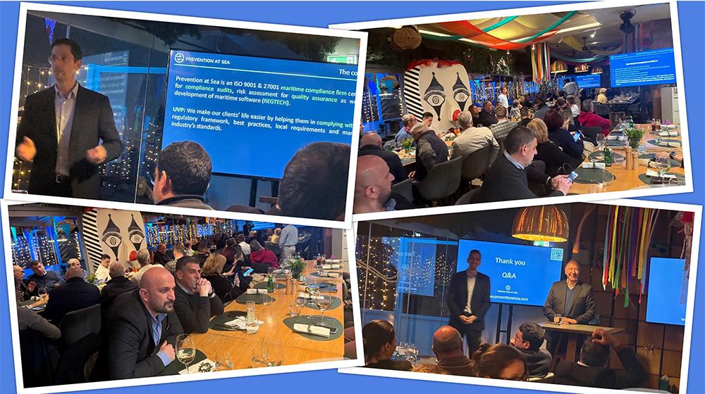 The speaker of the evening, Petros Achytypis, the CEO of Prevention at Sea specialises in Safety Management Systems and simplification techniques, pre-vetting, data analysis, and pattern identification for improving the ship operator potentials and Safety Culture, research and development of state-of-the-art risk assessment mechanisms, investigations, and behavioral competency audits.