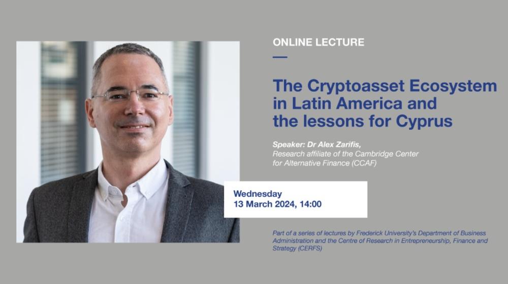 Frederick University's Centre of Research in Entrepreneurship, Finance and Strategy (CERFS) and the Department of Business Administration are organising an online lecture on the cryptoasset ecosystem in Latin America and the lessons for Cyprus. The lecture will be held via Zoom on 13 March at 14:00.