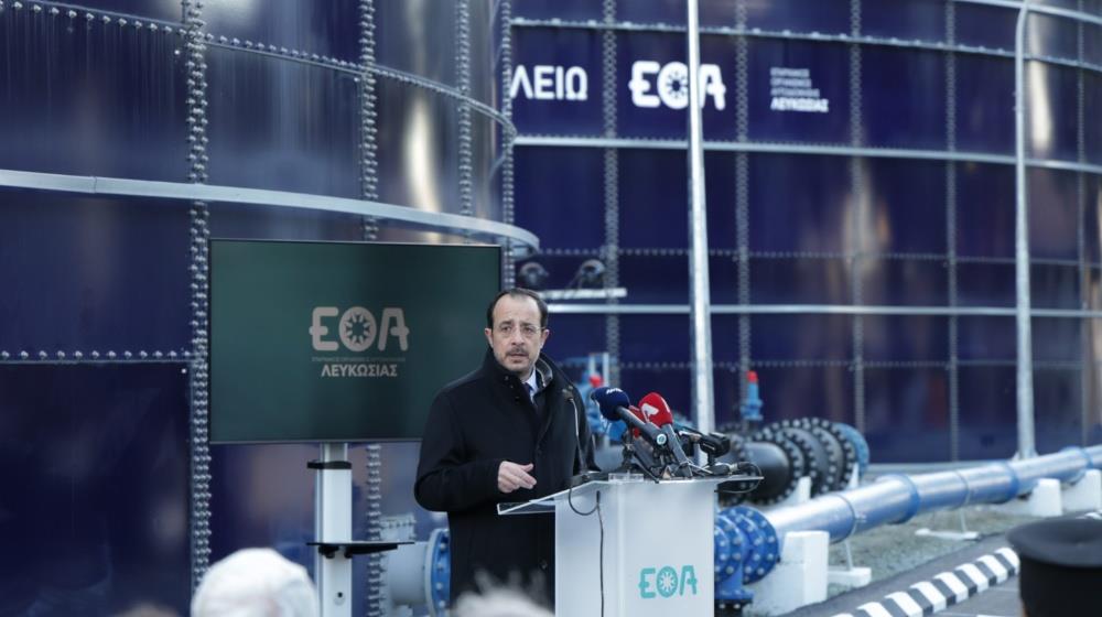 Our goal is, through specific actions, to achieve water security in our country, President Nikos Christodoulides has said, speaking at the inauguration ceremony of 'Cleo' and 'Erato', two GLS-type water tanks of the Nicosia District Local Government Organisation, with a total capacity of 17,200 cubic meters.